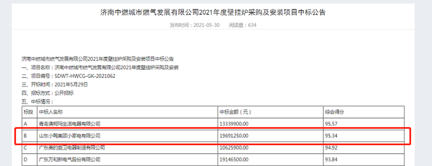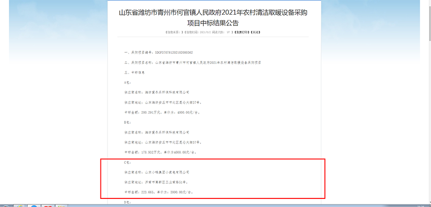 8月26日,泰安市公共资源交易网公示新泰2021年冬季清洁取暖改造项目设备采购第九标段招标结果,山东小鸭集团小家电有限公司作为首位候选品牌,成功中标。