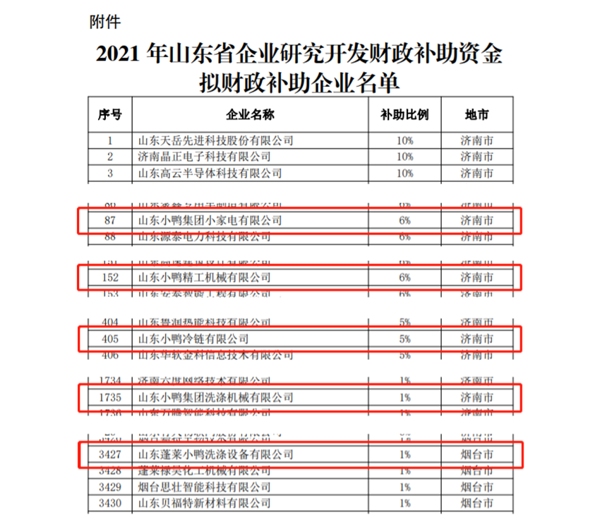 近日,2021年山东省企业研究开发财政补助资金审核工作已经完成并公示,山东小鸭集团小家电有限公司、山东小鸭精工机械有限公司、山东小鸭冷链有限公司、山东小鸭集团洗涤机械有限公司以及山东蓬莱小鸭洗涤设备有限公司五家公司申报成功,成为山东省企业研究开发财政补助资金补助企业。
